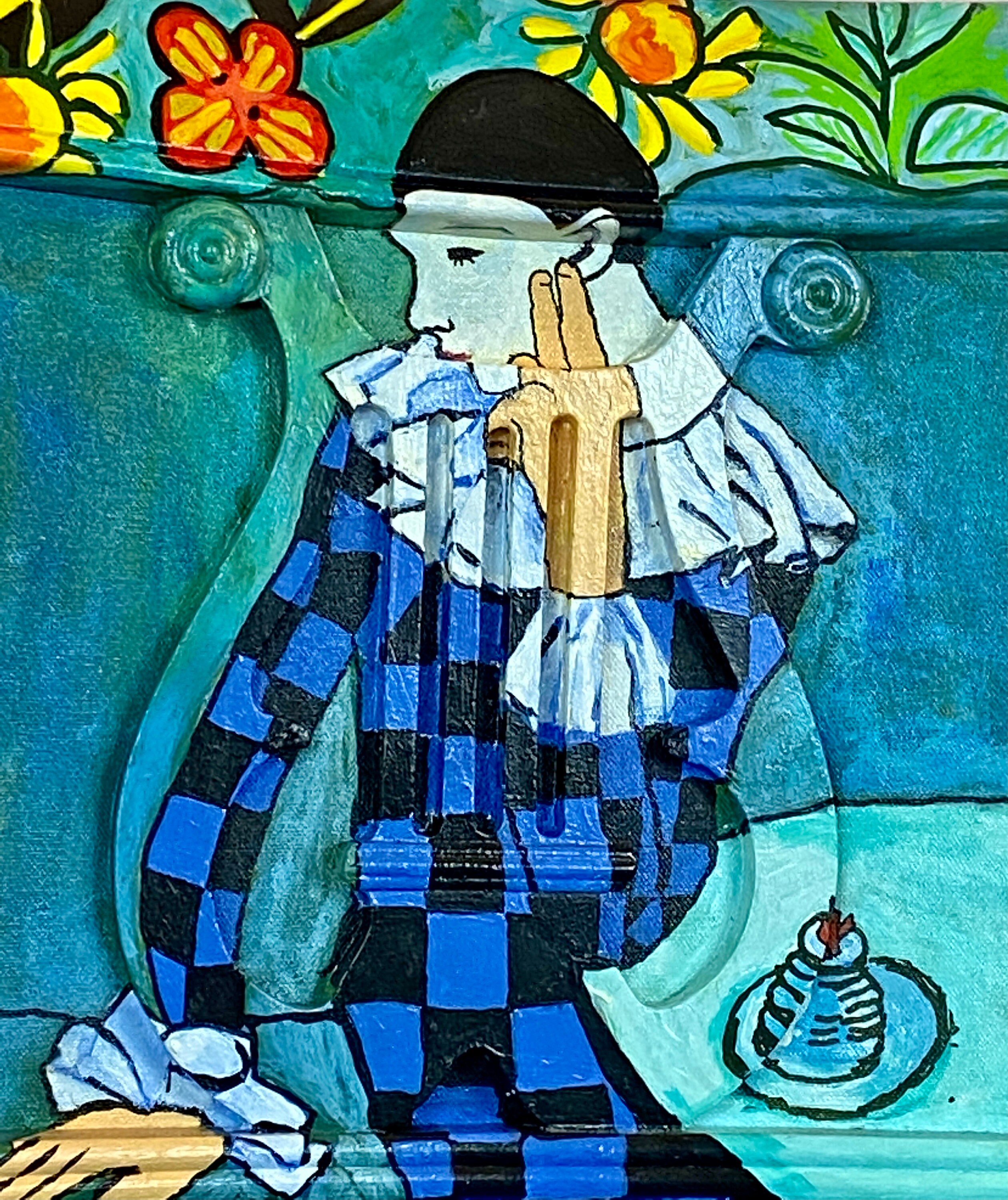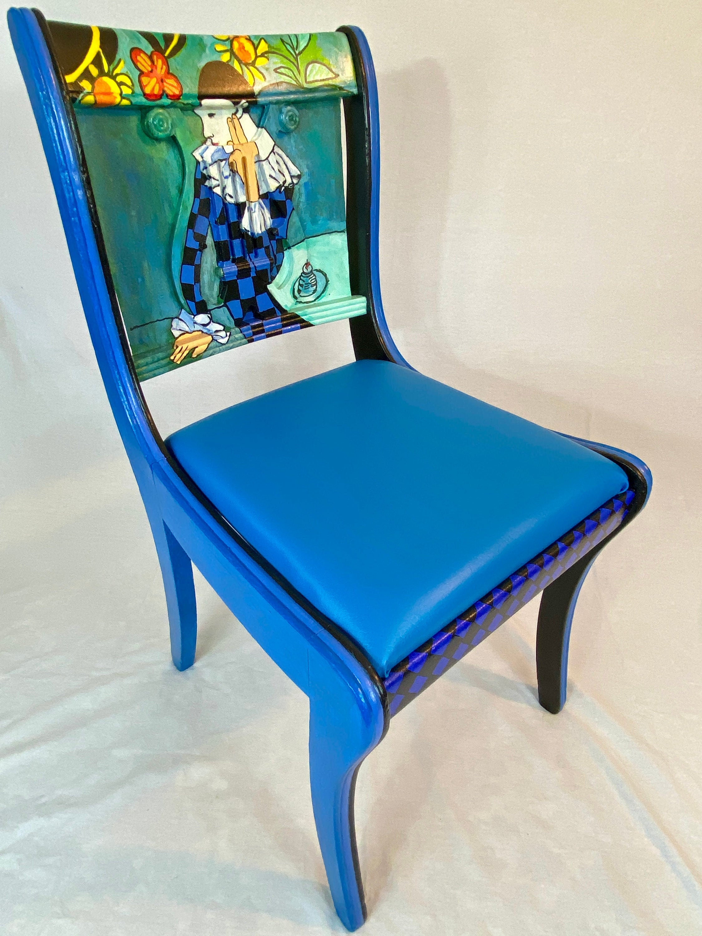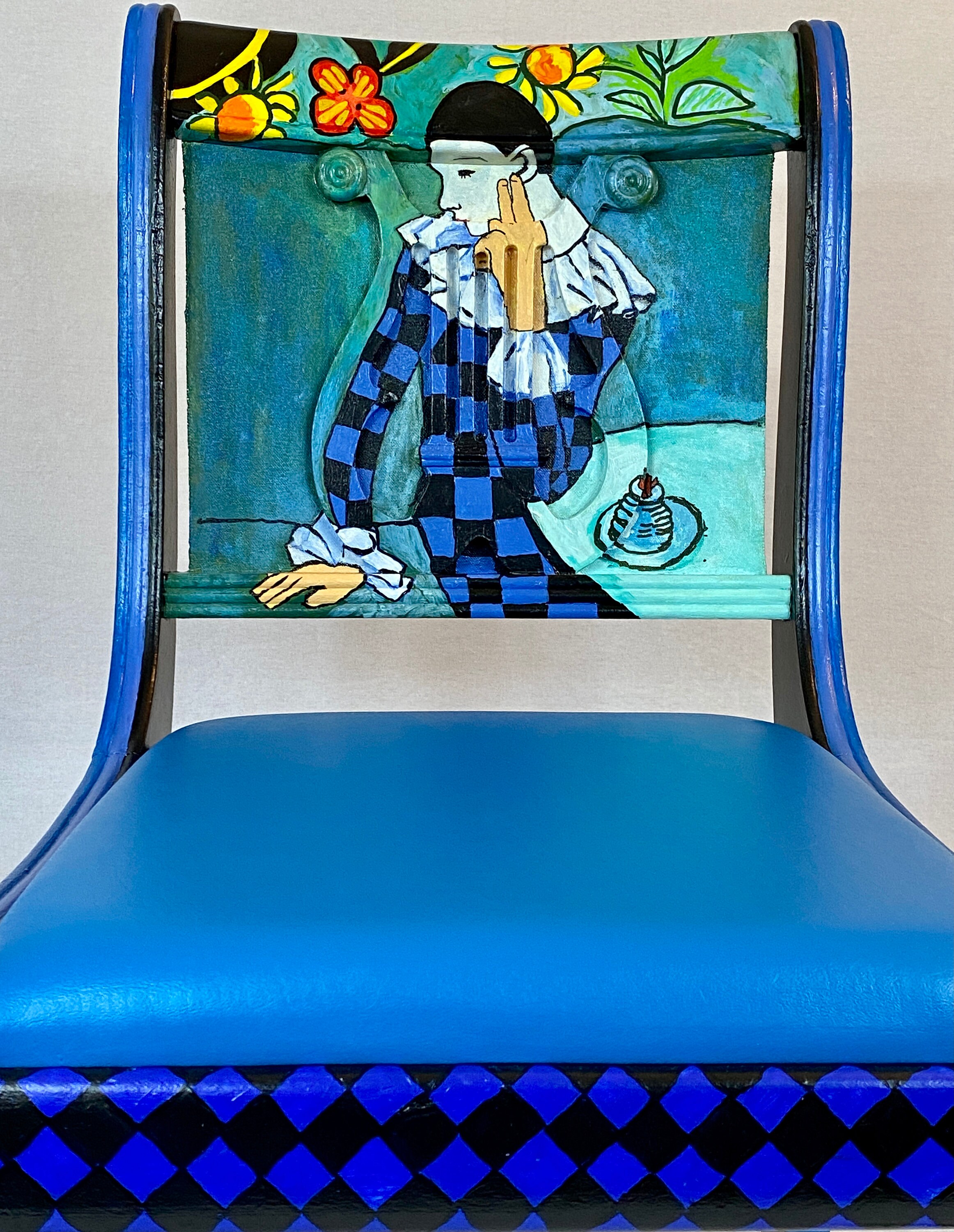 Blue is a great color with many different cheerful hues. However, the work from Picasso's Blue Period is far from cheerful. The harlequin captures the blue period and the cubist picture on the back portends his most celebrated contribution to art. I used a lyre chair which originated in the Greek Classical Period.